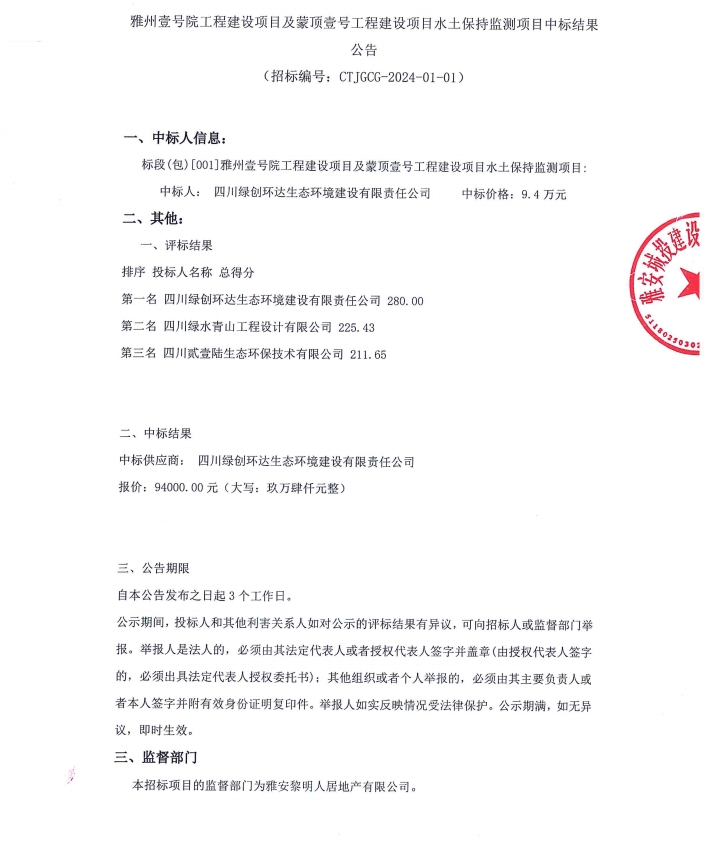 雅州壹號院工程建設(shè)項目及蒙頂壹號工程建設(shè)項目水土保持監(jiān)測項目中標結(jié)果公告