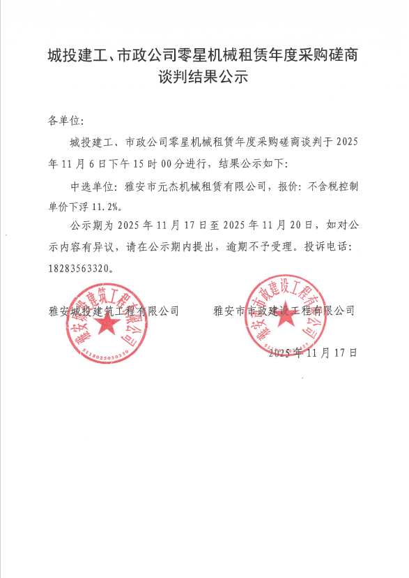 城投建工、市政公司零星機(jī)械租賃年度采購(gòu)磋商談判結(jié)果公示
