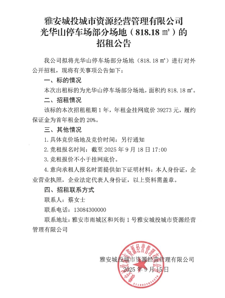 雅安城投城市資源經(jīng)營(yíng)管理有限公司光華山停車場(chǎng)部分場(chǎng)地(818.18㎡)的招租公告