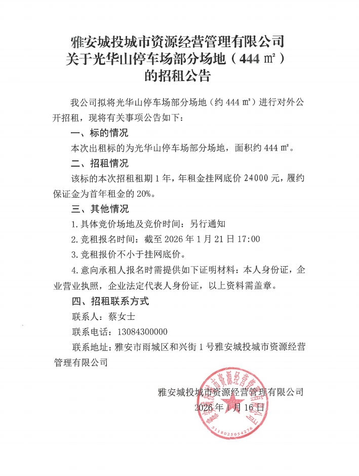 雅安城投城市資源經(jīng)營(yíng)管理有限公司關(guān)于光華山停車場(chǎng)部分場(chǎng)地(444㎡)的招租公告