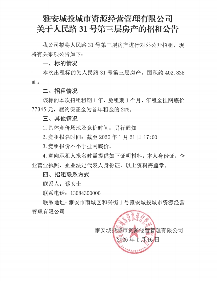 雅安城投城市資源經(jīng)營管理有限公司關(guān)于人民路31號(hào)第三層房產(chǎn)的招租公告